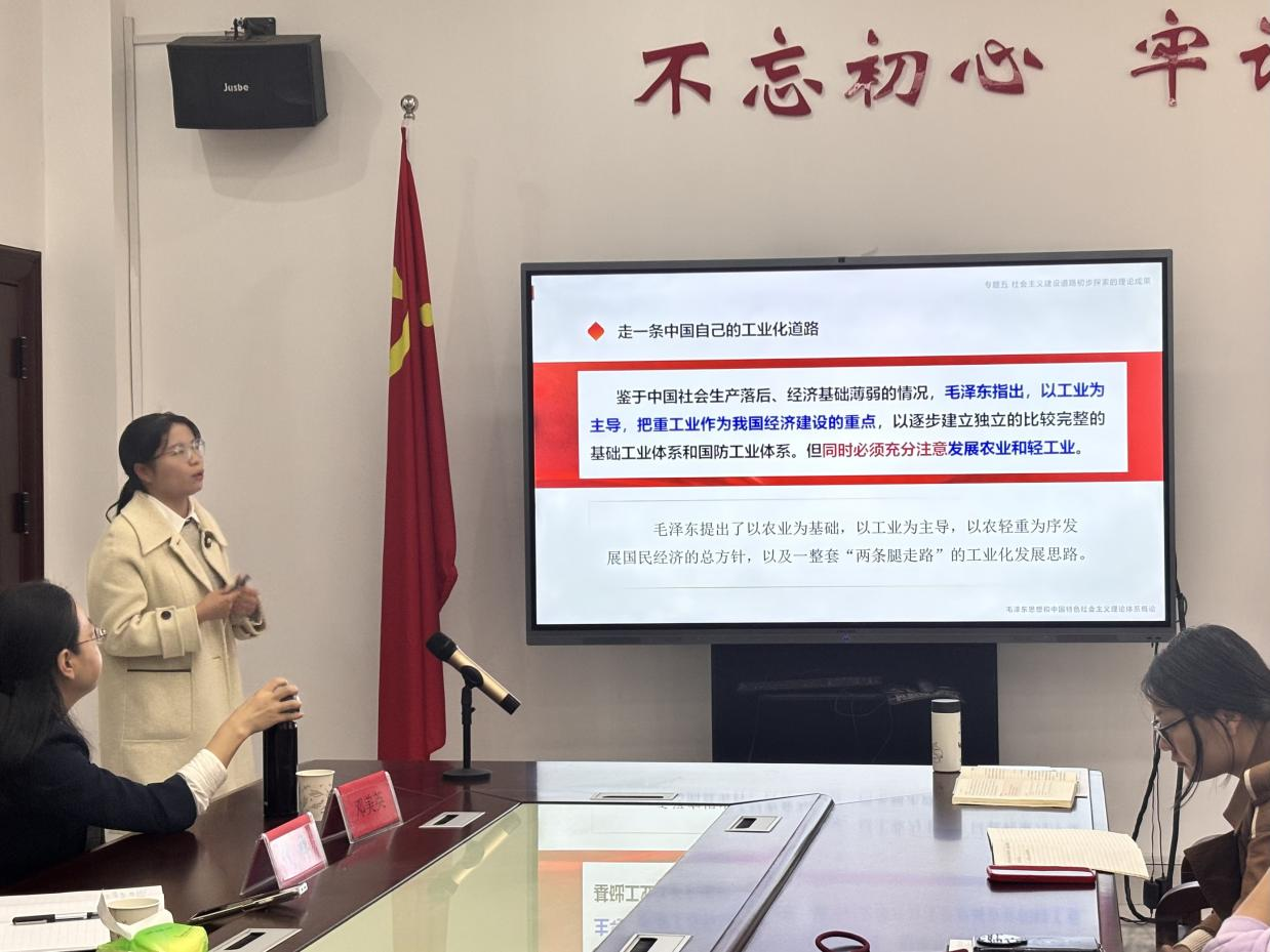 教学展示环节,来自宜春学院、宜春职院、宜春幼专及江西工程学院马克思主义学院的四位青年教师,围绕“毛概”课程的核心知识点呈现了风格鲜明的教学示例。宜春学院李小芳老师以“走一条中国自己的工业化道路”为题,紧扣历史逻辑与理论内核,聚焦“以农业为基础,以工业为主导”的核心方针,通过梳理发展脉络清晰阐释建成独立完整工业体系的目标。