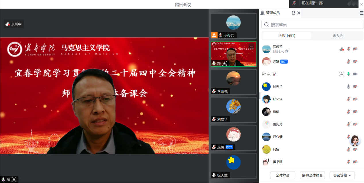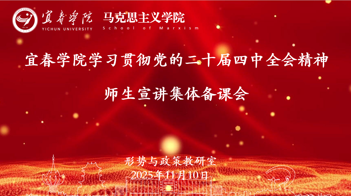 (本站讯 李小芳报道)为进一步全面深入学习贯彻党的二十届四中全会精神,用党的创新理论武装学生头脑,我校于11月10日晚在线上举行了学习宣传党的二十届四中全会精神师生宣讲集体备课会。会议邀请江西科技师范大学马克思主义学院院长郜志刚教授做教学指导,学校各二级学院负责宣讲专题的领导、老师,马院院长、书记李霞,副院长代祥,马院“形势与政策”教研室全体老师及部分教师、学生代表参加,会议由“形势与政策”教研室主任袁佳玉主持。