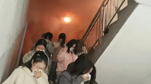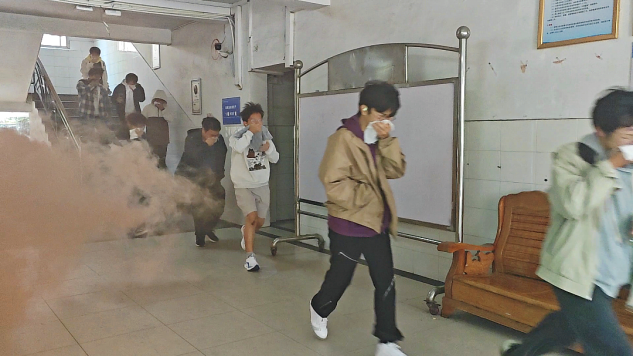 当日上午八点半,16栋、20栋学生宿舍内已准备就绪,同学们在宿舍内严阵以待。九时整,一声清脆的哨响划破校园宁静,楼道内模拟烟雾缓缓升起。同学们立即用湿毛巾捂住口鼻,保持低姿弯腰姿势,在疏导员的有序引导下,沿安全通道快速向篮球场集结。