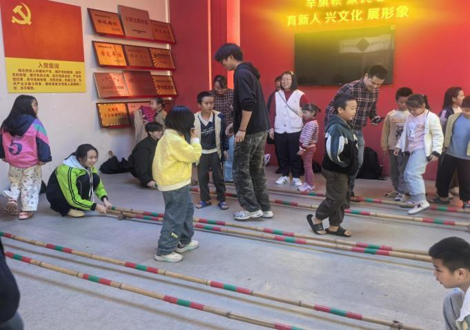 活动现场,当地小学生、中学生与我院青年团员结伴走进村史馆,在一件件老物件、一幅幅旧照片前驻足聆听,共同探寻村落的发展变迁与红色记忆,随后大家纷纷在留言板上写下对未来的美好期望,字里行间满是对民族团结的祝福。师生还与村里的小朋友们手拉手跳起欢快的竹竿舞,清脆的竹竿敲击声与欢声笑语交织,拉近了彼此的距离。