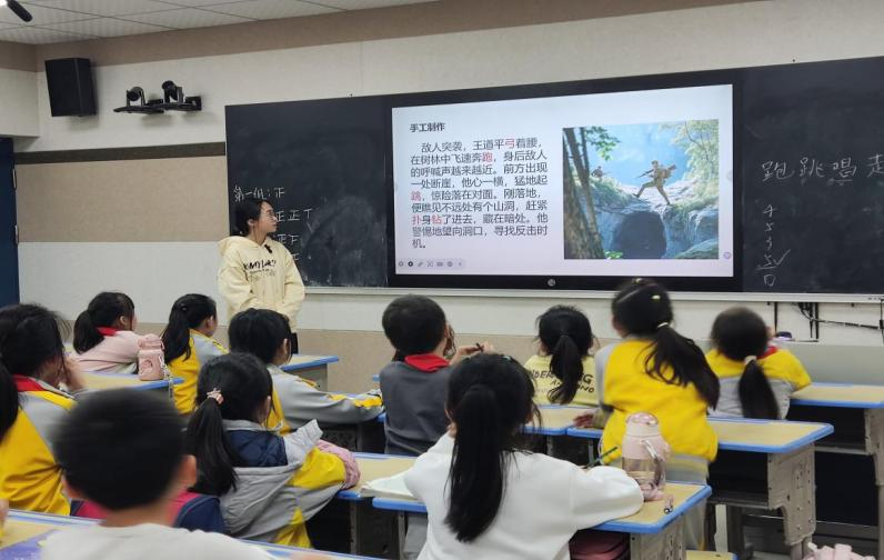 实验小学课堂上,志愿者以语文课本中“黄洋界上炮声隆”诗句为切入点,结合课本知识讲解黄洋界保卫战背景与过程,生动阐释“坚定信念、艰苦奋斗”等井冈山精神内涵,解读“星星之火,可以燎原”的深意。理论讲解后,“传声筒·传红色箴言”游戏点燃氛围,孩子们分组传递“井冈山精神永相传”等箴言,在欢声笑语中让红色理念扎根心底。这种“课本+故事+游戏”的创新形式,让红色教育走出课本,深化了孩子们对红色历史的理解。下一步,学院将继续深耕红色课后服务,助力孩子在红色浸润中成长。