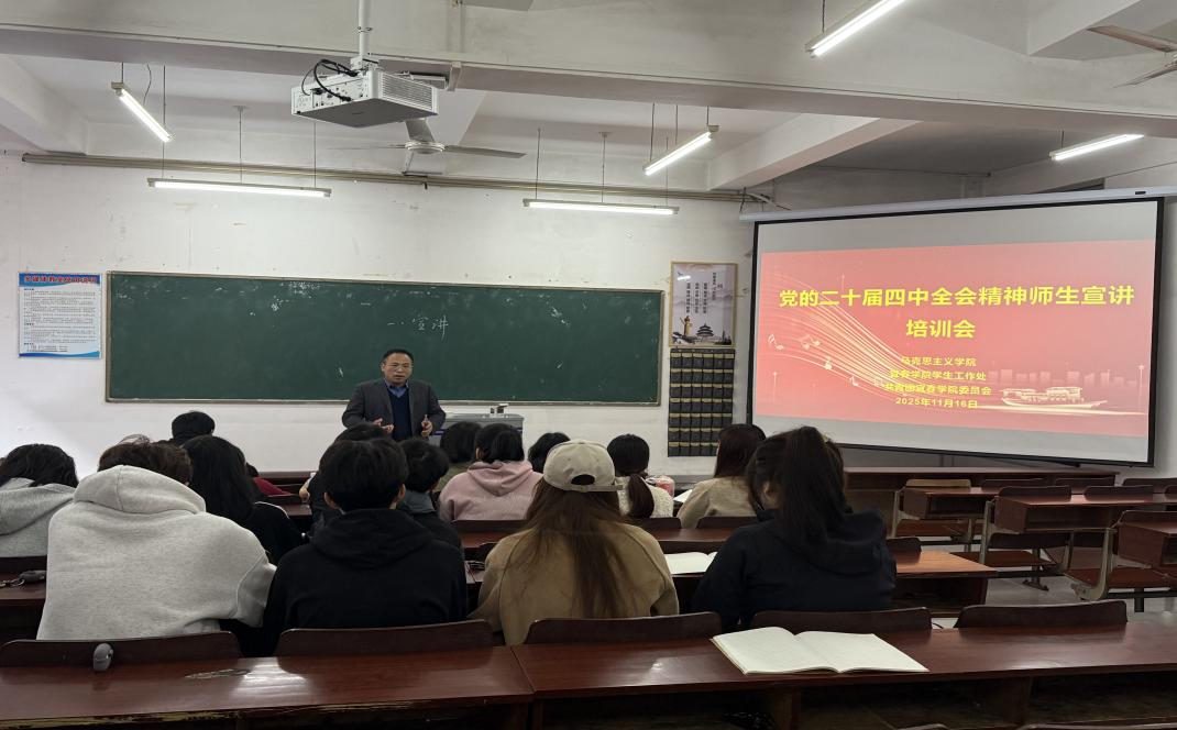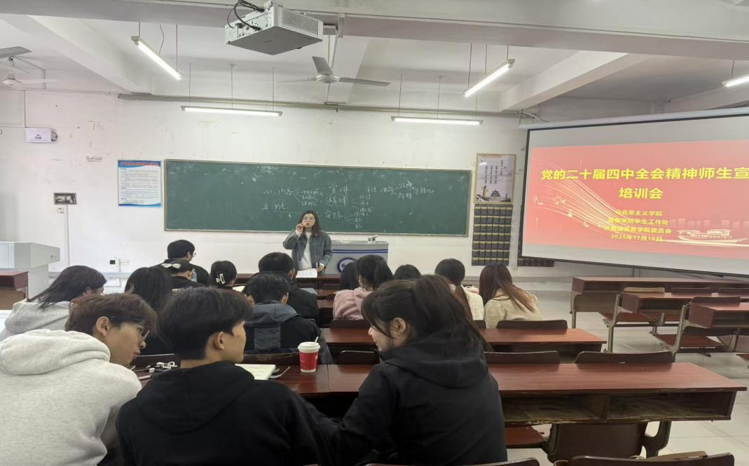 在培训会上,胡喜如博士从紧紧围绕习近平总书记在全会上的重要讲话和《建议》,从“十四五”时期我国发展取得的重大成就;“十五五”时期经济社会发展的重大意义;用通俗易懂的话语、鲜活的事例,把党的二十届四中全会精神讲清楚、讲准确、讲全面。王烨博士以宏阔的理论视野、严密的逻辑分析和丰富的实践案例,从深刻认识党的二十届四中全会的重大意义,准确把握“十五五”时期我国发展所处的历史方位,全面理解“十五五”时期战略任务和重大举措,为现场师生们进行了全面系统、深入浅出的解读和阐释。