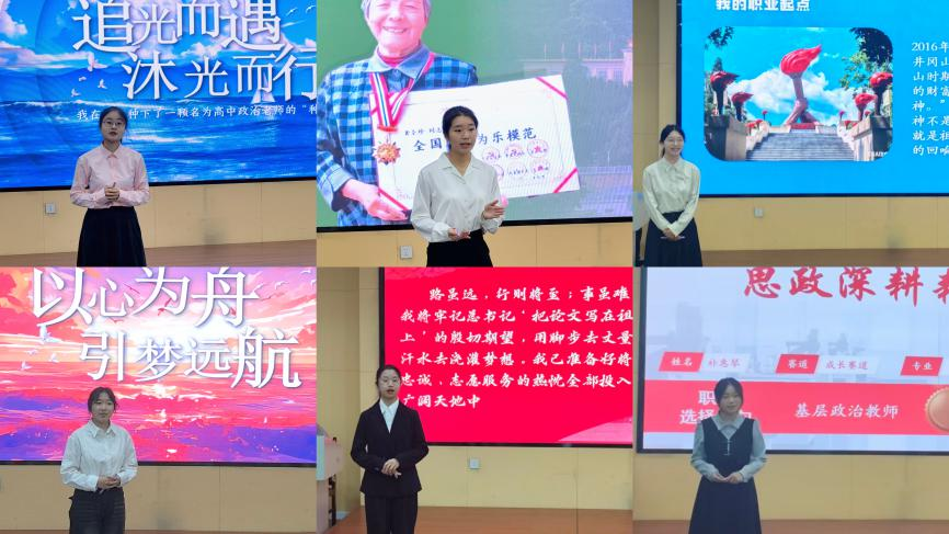 比赛现场,七位选手们聚焦不同职业赛道,既有立志深耕思政教育,愿以初心育桃李、用使命传星火的思政课教师职业构想;也有怀揣基层情怀,计划扎根红土的基层工作者规划;还有着眼职业教育领域,希望以心为舟、引梦远航,助力他人明晰成长路径的职业规划课教师发展蓝图。七位选手结合自身特质与成长规划,依次完成职业讲解展示,她们表达真挚、逻辑清晰,充分展现对未来职业的深刻认知与坚定追求,赢得现场阵阵掌声。