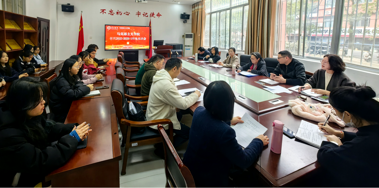 (本站讯 伍小红报道)为精准把握思政课教学现状,推动思政课教学提质增效,12月2日,马克思主义学院召开2025-2026学年第一学期期中教学检查师生座谈会。院党委书记、院长李霞,副院长代祥,教研科科长龚海艳,校督导王淑娥、各教研室主任及来自全校各学院2024级、2025级学生信息员代表参会,会议由龚海艳老师主持。