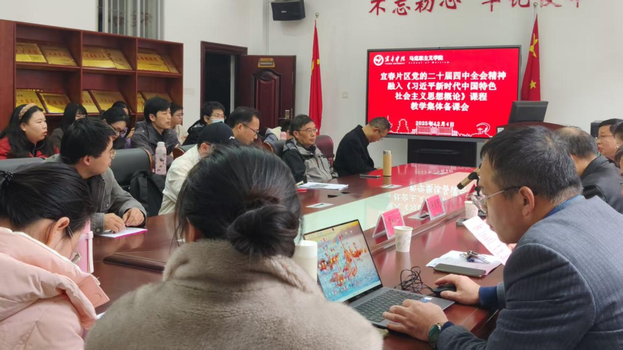(本站讯 25级思政班刘雨欣报道)12月4日下午,宜春片区“党的二十届四中全会精神融入‘习近平新时代中国特色社会主义思想概论’”课集体备课会在我院智慧会议室举行。来自宜春学院、宜春职院、宜春幼专三校“习近平新时代中国特色社会主义思想概论”课骨干教师及我院青年教师40余人齐聚一堂,聚焦“全会精神进课堂、进头脑”主题,围绕案例式、议题式、沉浸式教学创新展开深度研讨。会议由我院党委委员、“习近平新时代中国特色社会主义思想概论”课教研室主任罗俊芳主持。