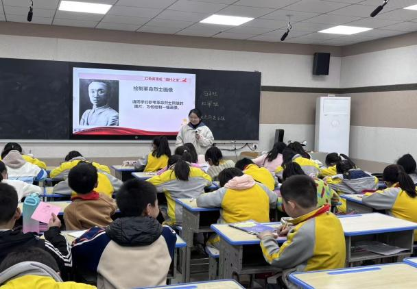 在凤凰小学的课堂上,课程围绕庙前村的红色历史,通过PPT展示、故事讲述与互动问答,生动再现峥嵘岁月。学生们踊跃参与“绘制革命烈士画像”“红色知识大比拼”等活动,并齐唱红歌致敬英雄。