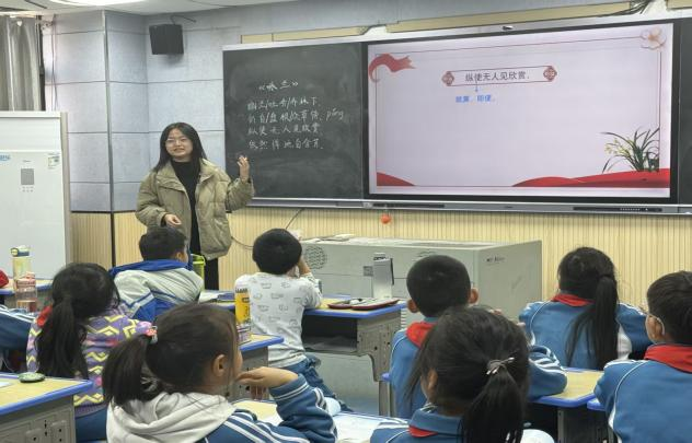 实验小学的课堂以“猜兰花”趣味谜语开场,围绕朱德《咏兰》诗句,讲述伍若兰烈士如兰草般坚韧忠贞的一生。学生们绘制兰花、朗诵诗歌,在艺术与文学中体悟革命者的高洁品格。