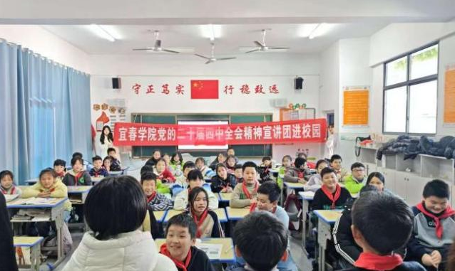 (本站讯 24级思政1班师宝贞报道)继在宜春市袁河小学成功展开“党的二十届四中全会精神宣讲”的活动后,为持续扩大覆盖面、深入推动党的创新理论融入校园、浸润童心,12月15日下午,由我院牵头成立的宜春学院“党的二十届四中全会精神‘红一角’师生宣讲团”再次出发,走进宜春市第九小学,为小学生们带来了一场深入童心的主题宣讲活动。