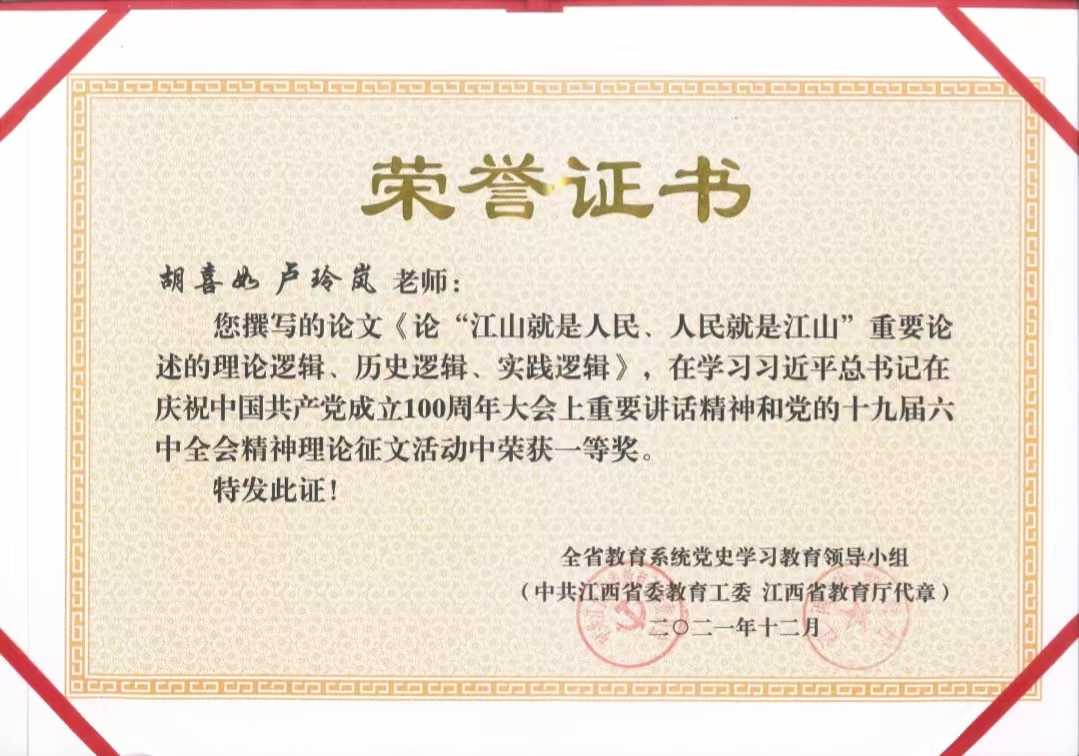 科研是教学的源头活水。他参与完成2项国家社科基金项目,主持江西省社科“十三五”“十四五”规划项目2项,合作撰写的论文《中国共产党强化制度执行力的百年探索及基本经验》荣获江西省第二十次社会科学优秀成果二等奖;论文《论“江山就是人民、人民就是江山”重要论述的理论逻辑、历史逻辑、实践逻辑》荣获全省教育系统理论征文一等奖。学术探索深度反哺育人厚度,真正践行“教学即研究”。