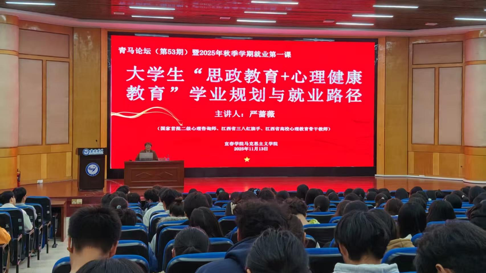 (本站讯 25级思政班刘雨欣报道)11月13日晚,我院青马论坛(第53期)暨2025年秋季学期就业第一课在主教楼学术报告厅举行,国家首批二级心理咨询师、江西省三八红旗手、江西省高校心理教育骨干教师严蔷薇教授担任主讲嘉宾,我院23、24和25级全体同学参加,讲座由院学工办主任黄家驹老师主持。