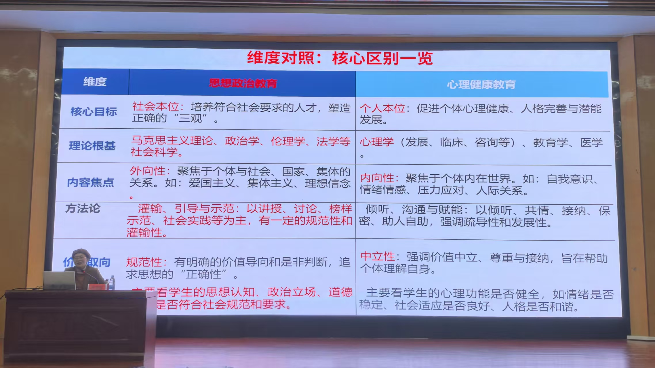 在专业深度剖析环节,严教授从“相同点、不同点、内在联系”三方面清晰梳理了思政与心理健康教育的关系。明确指出二者的相同点在于教育对象均为人,终极目标都是落实立德树人根本任务,促进人的全面发展;不同点体现在思政教育侧重社会本位,心理健康教育侧重个体本位,且在理论基础、内容焦点等方面存在差异,其二者的内在联系则表现为双方的双向渗透、有机融合。同时,严教授还对比了二者的能力模型,为同学们点明将思政专业与心理健康相结合的提升方向。