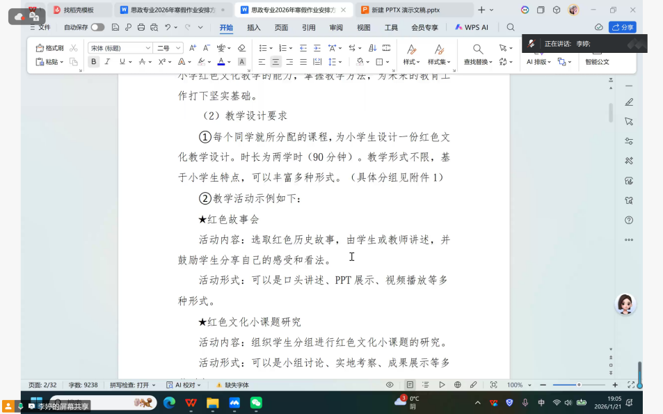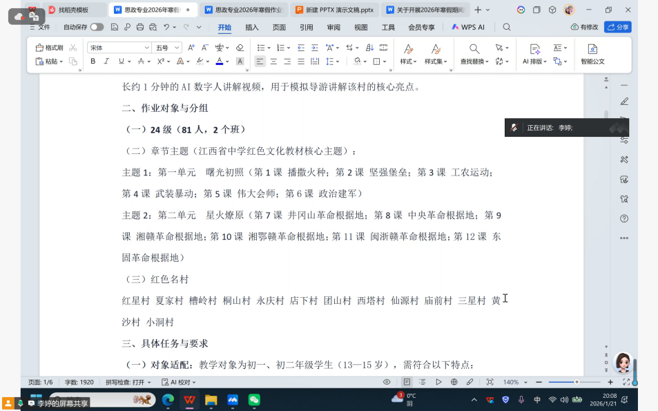 会上,李婷老师部署两项核心作业。一是红色文化教学设计的制作,需围绕江西本地红色资源和宜春本地红色名村进行设计,覆盖教学目标、案例解析、互动环节,突出思政教育与红色基因的融合;二是聚焦乡村文化的调研,通过网络等方式搜集并研究分析家乡农村的基本概况、历史脉络、乡村文化资源等信息,到1-2个行政村开展实地调研,形成调查报告。
