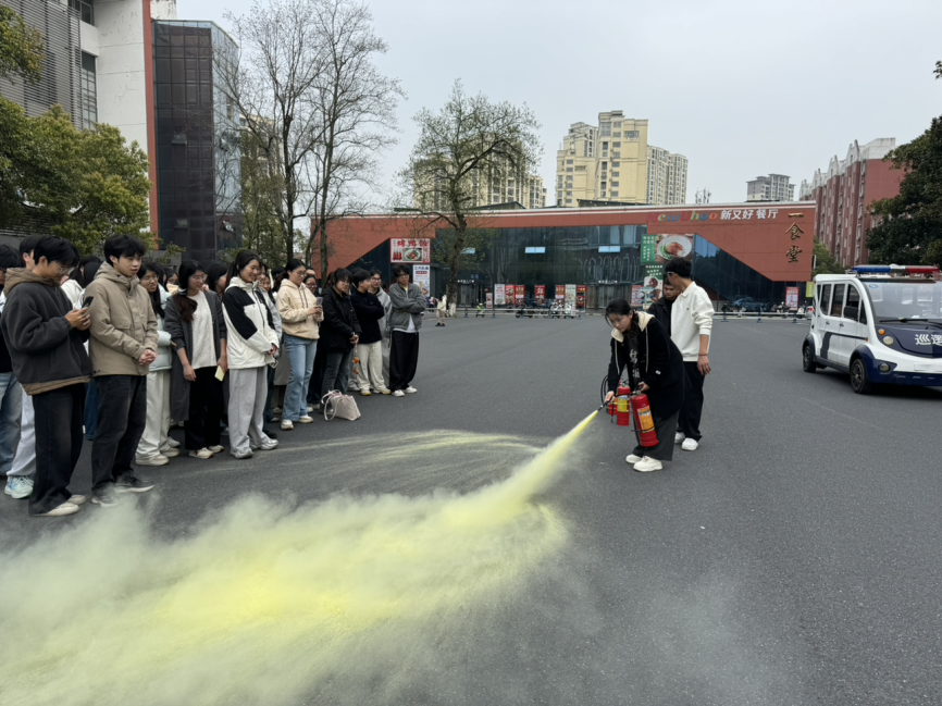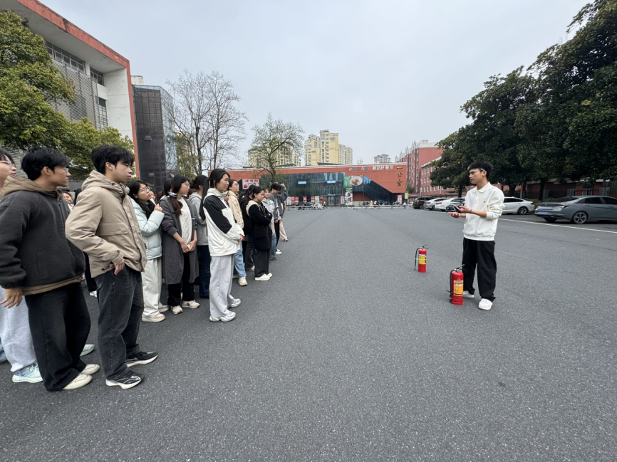 集结完毕后,保卫处晏祖望老师对本次疏散环节的整体表现给予肯定,并现场讲解干粉灭火器的使用方法——“提拔按压”四步法。他鼓励学生亲身体验,在他辅助下多名学生成功上手操作,切实将理论知识转化为实际操作能力。同学们纷纷表示,学会了真本事,以后遇到突发情况就不慌了。