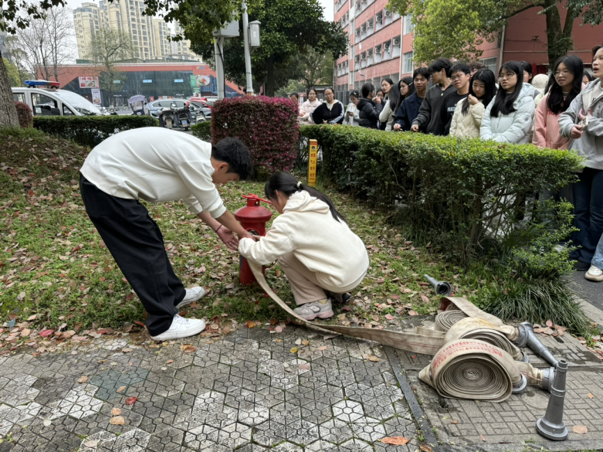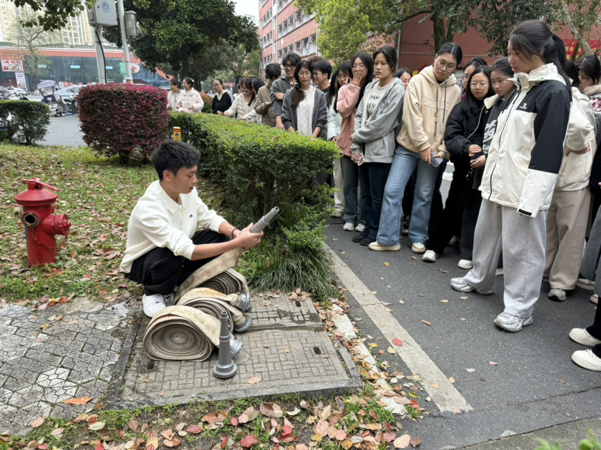 紧接着,晏老师讲解了户外消防栓的使用技巧,从消防水带与水枪头的卡扣式拼合方法讲起,亲自演示水带连接消防栓出水口、旋转阀门开启水流的全过程。他一边指导学生上手完成拼合、接驳等动作,一边结合实操细节强调“消防栓操作看似简单,实则考验配合,水带拼接不紧密容易漏水,阀门开启力度要适中”,整个教学过程轻松高效,学生们上手也愈发熟练。